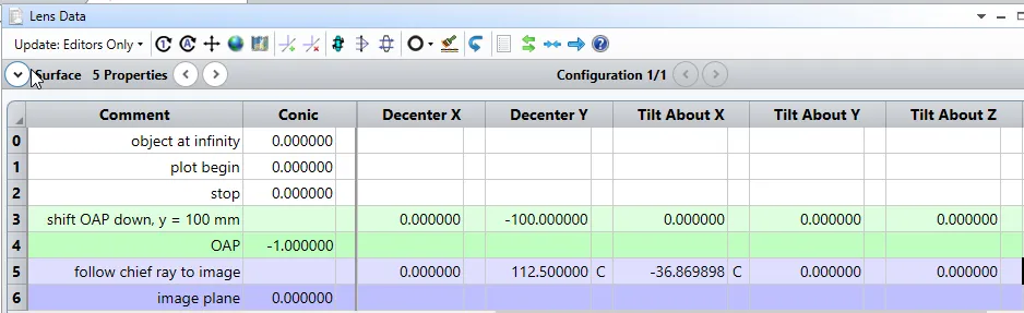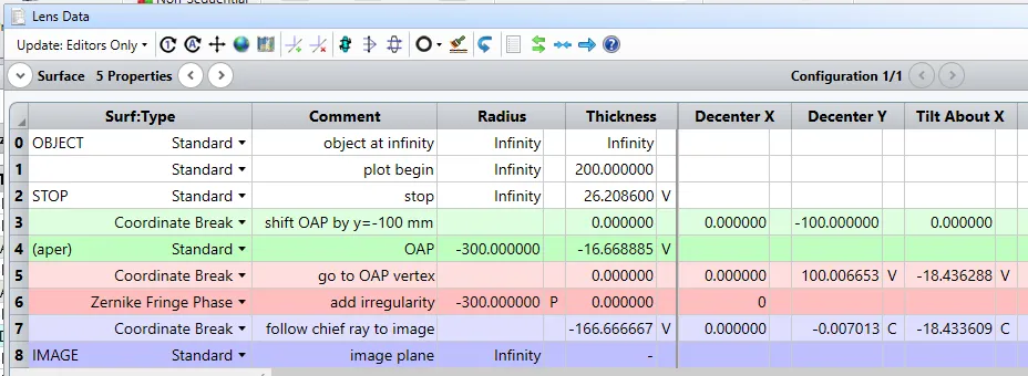 为了将相位表面放置在OAP的顶点处,并确保它与OAP顶点相切,将从主镜的顶点出发,沿Z轴方向移动相位表面,使其回退至适当位置。这一移动的距离由镜头数据编辑器中第4行的厚度值控制(如图3所示),该值被设定为一个变量。同时,第5行中的“Decenter Y”和“Tilt About X”项也被设置为变量,以便我们可以根据需要调整相位面的倾斜和位置。