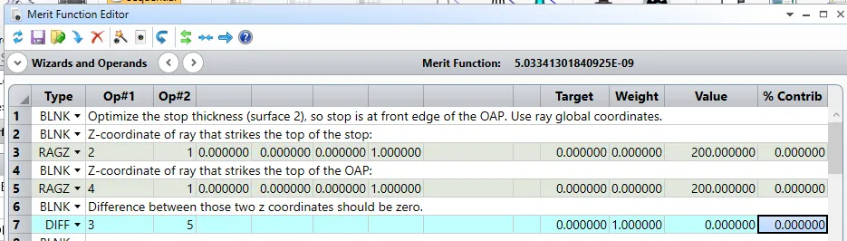 图 4:在评价函数编辑器中,第 1 行到第 7 行确保光阑位于 OAP 的前缘。