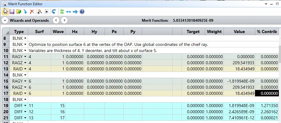 在以下的评价函数中,我们使用了RAGY(全局光线Y坐标)、RAGZ(全局光线Z坐标)和DIFF(两个操作数的的差值)操作数,来确保击中OAP的主光线和相位表面的主光线具有相同的Y和Z坐标。具体地,第11、15和19行控制Y坐标的匹配,而第12、16和20行则负责Z坐标的匹配。此外,RAID(实际光线入射角)和DIFF操作数(分别位于第13、17和21行)要求OAP和相位面的入射角相等,以确保相位面在OAP中心处,并与OAP具有相同的倾斜度。