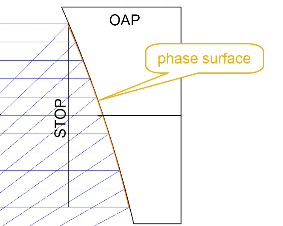 在“OAPWithPhaseSurface_v03_OffsetPhaseSurface.zar”文件中,我们已经利用第5行的厚度值将相表面稍微后移,使其在物理位置上位于OAP表面之后。这时光线需要在OAP后传播极小的距离才能到达相位面,但相位面依然可以正常工作。不过,这种偏移并不是必须的,只是为了使得布局图更易于理解。