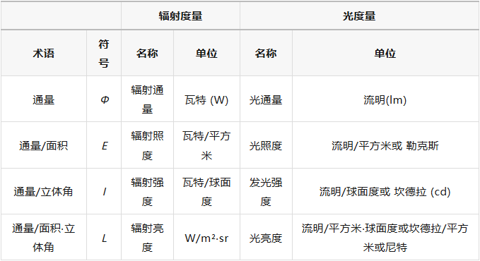 *请注意Φ、E、I、L并不是任何时候都使用的,有时 P、H、 J 和 N 用于相应的辐射度量,而 F、E、I 和 B 用于相应的光度量。