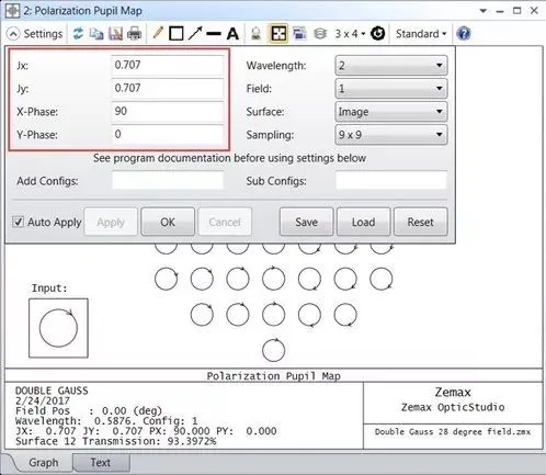 所有OpticStudio中的偏振分析都需要定义输入光的偏振态,通常情况下这些分析使用琼斯向量 (Jx, Jy) 来表示X和Y方向上不同起始相位的偏振分量。在OpticStudio中有两种输入光偏振态的方法。第一种是在每个独立的分析功能中设置明确的输入偏振态(Jx, Jy, X/Y起始相位),例如偏振光线追迹 (Polarization Ray Trace) 和偏振光瞳图 (Polarization Pupil Map)。