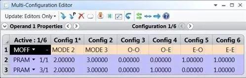 有时候我们也会想要分析只有寻常光或非寻常光时的结果。使用多重结构可以非常简单快捷的观察不同情况下的分析结果,如下图所示。多重结构操作数PRAM用来调整双折射输入表面的模式参数。结构3中,表面1和3的模式参数设为0(寻常光),因此备注行标注了“O-O”。结构4中表面1和3分别设为0(寻常光)和1(非寻常光),因此备注为“O-E”,其他结构以此类推。