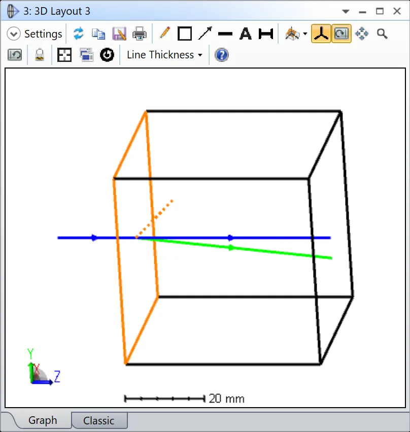 在本节使用的示例文件中我们可以看到,第二块晶体的非寻常折射率使光线在晶体与晶体的交界面发生了偏折。在第一块晶体中,光轴方向与局部Z轴一致,因此不同偏振态光线的折射率相同。需要注意的是,在双折射介质中S偏振所在的平面与晶轴垂直,P偏振所在平面与晶轴平行。因此当光线沿晶轴方向入射时,两偏振态的光无法区分。在第二块晶体中,晶轴方向与局部X轴重合,S偏振态仍然与晶轴方向垂直,P偏振态与晶轴平行。此时两种偏振态的光可以被区分开来,因此Y方向上的偏振光在晶体与晶体的交界面上会产生偏折。