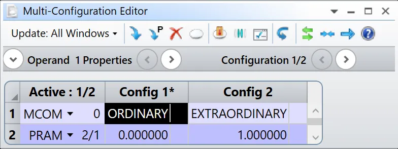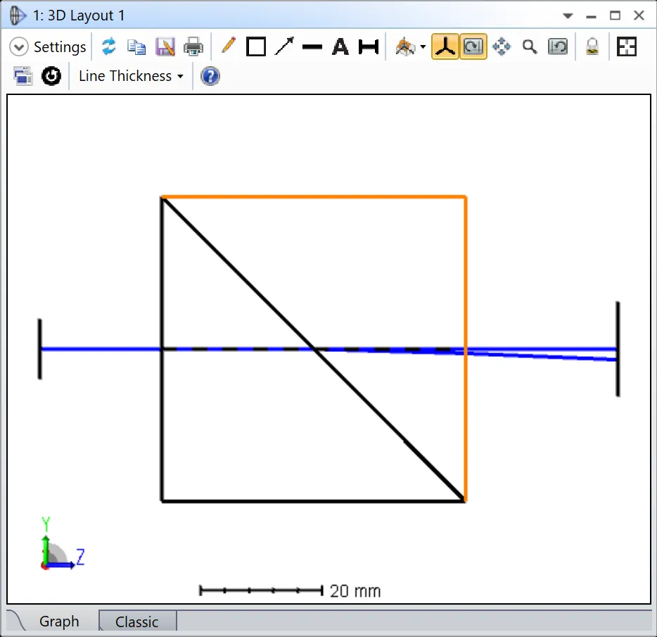 您可能会对布局图中的结果存在一些疑问:光线因双折射而分裂为寻常光和非寻常光两个分量,但是在序列模式下光线是无法产生分裂的(这意味着输入一条光线时输出也是一条光线)。实际上OpticStudio执行了两次光线追迹分别追迹两种情况,并使用模式参数 (Mode Flag) 来决定当前光线追迹的类型: