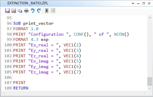 假设我们需要计算偏振光的消光比。如果通过实验的方法进行测量,我们需要使用Y方向偏振的光入射偏振器并测量透过的光强,再计算X方向的偏振光透过的光强并计算两者之比。实际上这也是OpticStudio计算消光比的方式。唯一复杂的点在于透过的光强为两个结构的相干叠加。因此我们需要先计算场振幅的叠加再计算光强。最简便的方法是使用ZPL宏来完成这一计算过程。