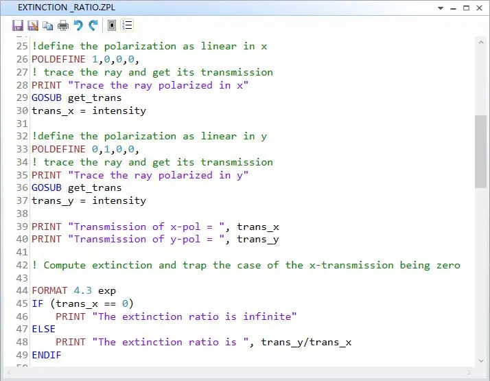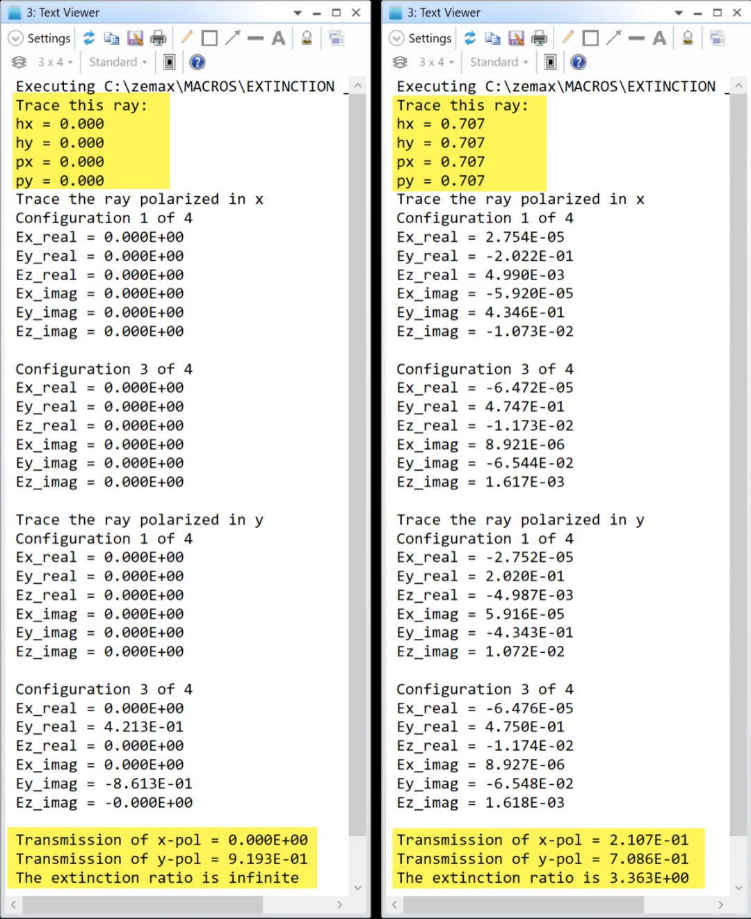 使用这段宏追迹轴上光线的消光比时其结果为无穷大;当计算倾斜光线时其结果显示少部分X方向的偏振光穿过了偏振器,因此存在一定的消光比数值: