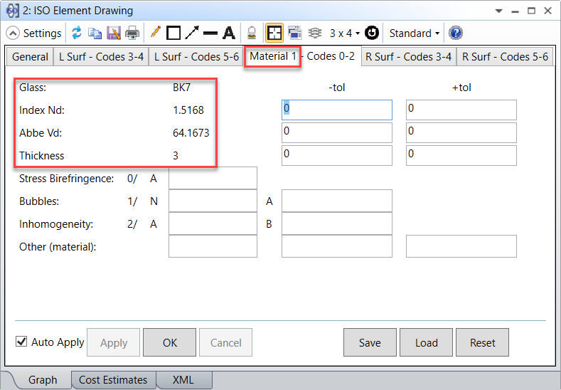 如果使用ISO 元件制图绘制单透镜或双胶合透镜,将会出现每个元件的“材料 ( Material )”选项卡。这个选项卡包括的材料属性:玻璃的名称、折射率、阿贝数、厚度、应力双折射 ( Stress Birefringence )、气泡度 ( Bubbles )、各向异性 ( Inhomogeneity )和其它材料规格。