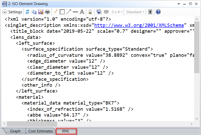 在 XML 输出中,元件和属性是根据 ISO 元件制图设置对话框和镜头文件的其他数据中输入的值来填充的。可以使用常规选项卡的“另存为 ( Save As )”按钮将 XML 输出数据保存到文件中。