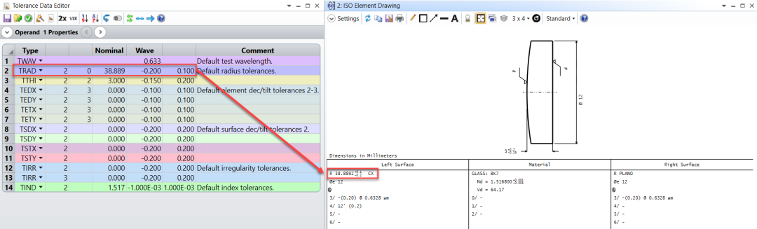 1.TTHI 是厚度公差,因此与表面的相对位置有关,在本例中表示单透镜厚度的公差,在ISO 元件制图的材料选项卡中出现。在输出的图纸中,此公差显示在输出的截面图中,指定了厚度。