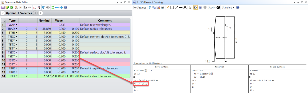 4.TSDX 和 TSDY 表示 X 和 Y 方向的表面偏心公差,而 TSTX 和 TSTY 表示 X 和 Y 方向的表面倾斜公差。这些操作数也出现在ISO元件制图的代码 3-4选项卡中。在输出的图纸中,这个公差显示在表面属性相关参数的“4/”条目中,它表示中心公差。需要注意的是,TSTX 和 TSTY 是以度为单位表示的,而 ISO 元件制图输出是以弧分为单位表示的。