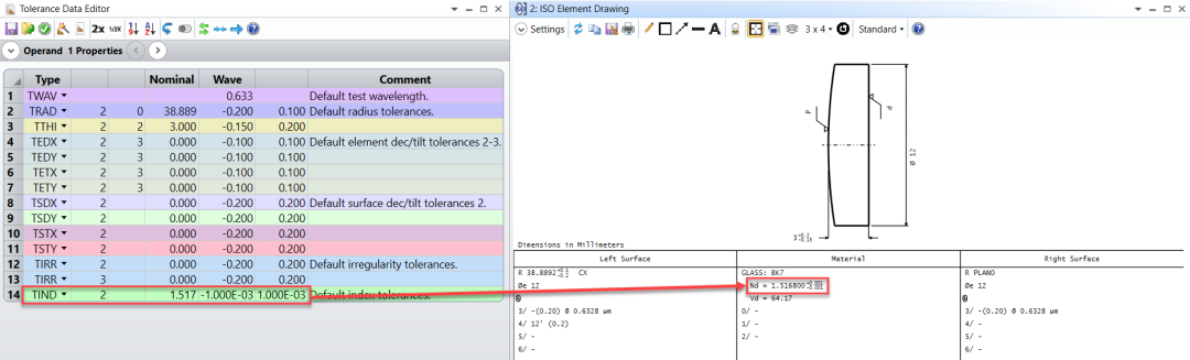 5.TIND 表示折射率公差,在 ISO 元件制图的材料选项卡中。在输出的图纸中,此公差显示在材料属性相关参数的第二行,也显示折射率值。