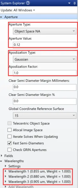 在本例中,假设进入光谱仪的光来自单模光纤。因此,可以将入射针孔作为点光源进行建模。因此,在系统选项(System Explorer)中,孔径类型(Aperture Type)设置为物方空间NA(Object Space NA),孔径值(Aperture Value)设置为0.12。此设置对应于光纤的接收角。此外,将高斯切趾因子设置为1.0,来达到光束的强度分布。将波长设置为0.855µm, 0.880µm (主波长)和0.905µm,以覆盖光谱仪所需的带宽。