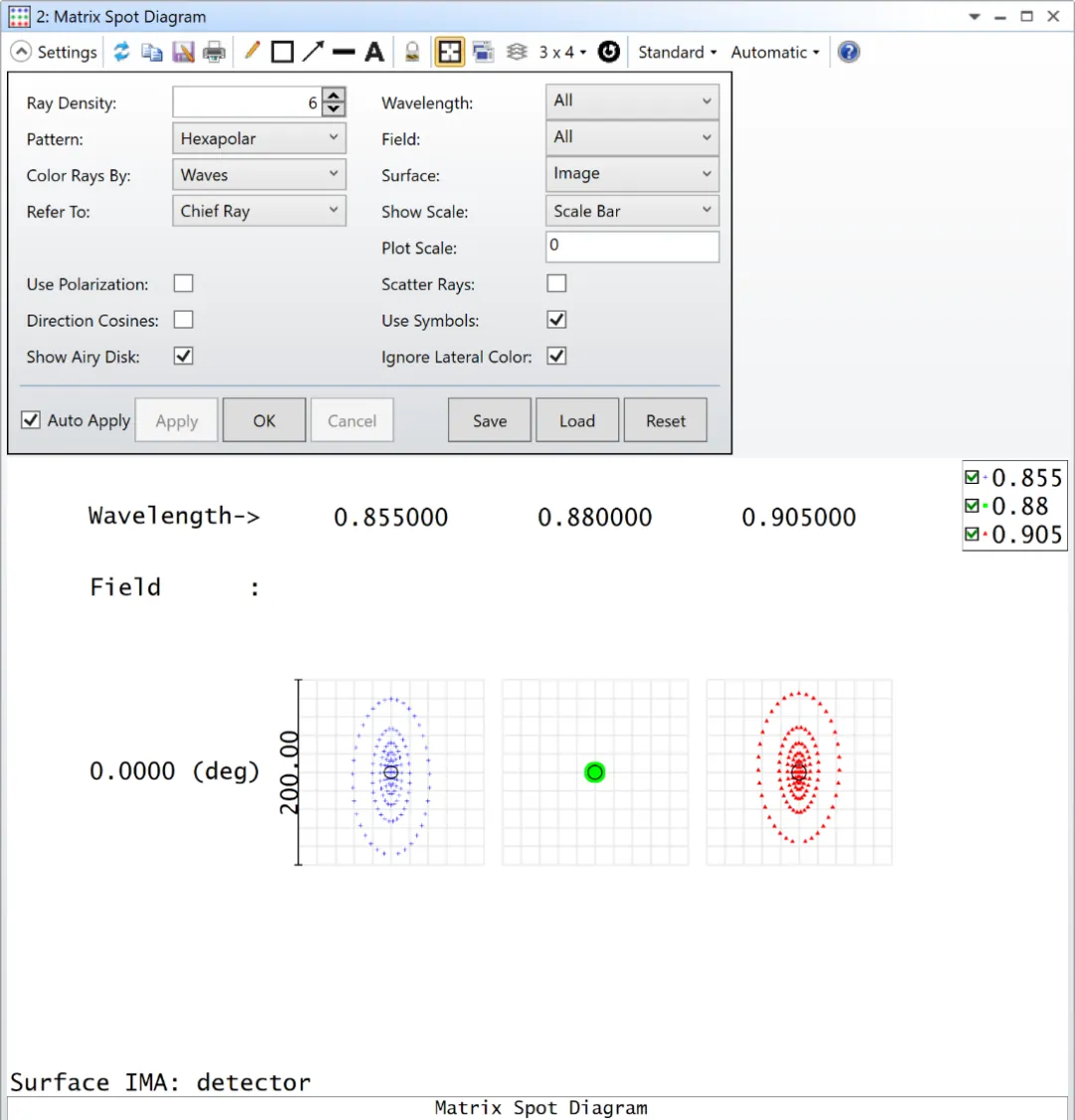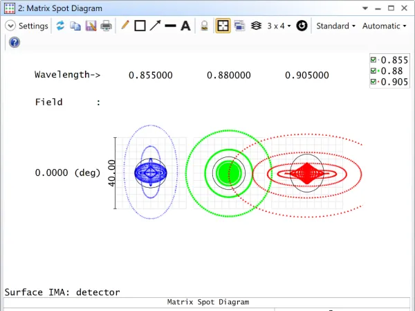 然而,查看矩阵点列图 ( Matrix Spot Diagram ) 发现:在中心波长(880 nm)处的光斑大小接近衍射极限(以黑色圆圈表示艾里斑),但在其他波长处还没有接近衍射极限。