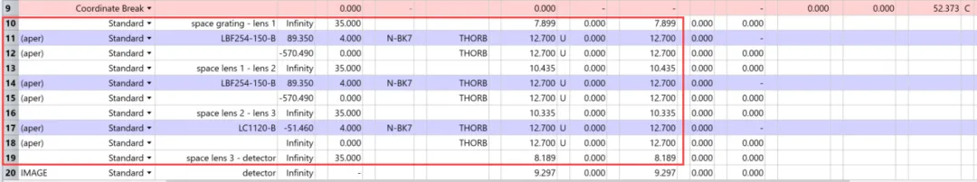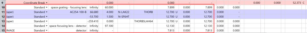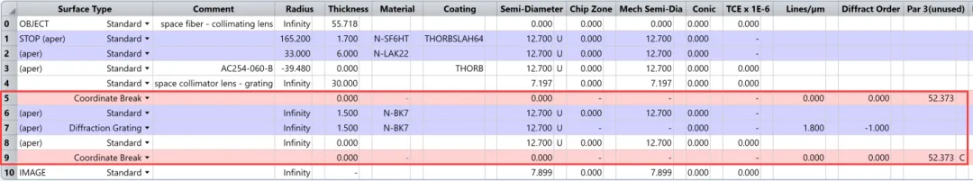 接下来,将衍射光栅插入系统。参考光栅规格,在镜头文件中输入以下行: