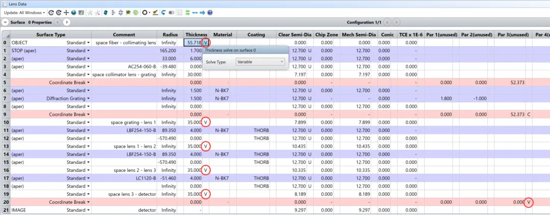 在优化系统之前,需要确定哪些参数可以设置为变量。在本例中,将透镜之间的所有空间距离,以及光纤与准直透镜之间的空间距离设置为变量。此外,在探测器前面插入坐标断点,如前一节所述,使其可倾斜。这样就得到了最终的镜头文件: