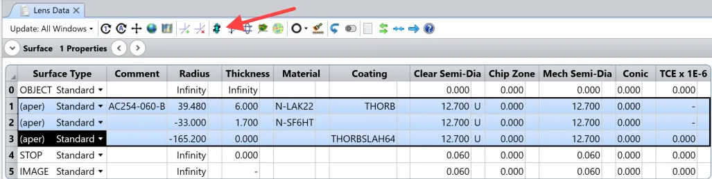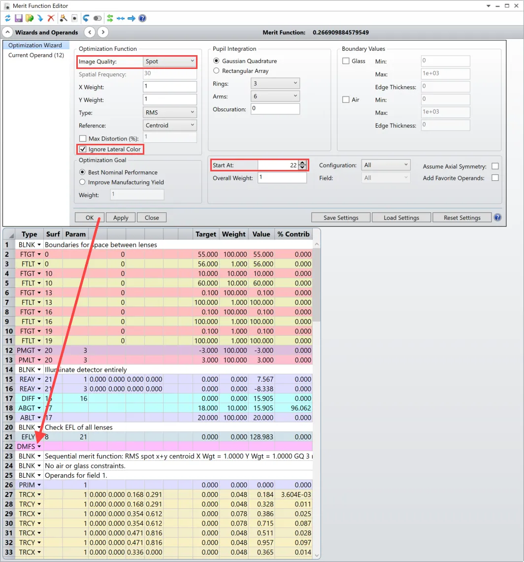 - 第22行及以下行:优化最小光斑尺寸。这些行是使用优化向导自动生成的,如上图所示。