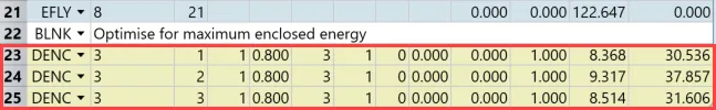 下一步,也是最后一步,通过锤形优化得到最终的解。此时,需要对评价函数进行修改,因为现在已经达到了系统的衍射极限。我们将不再对光线进行优化,而是对衍射极限的圈入能量进行优化。通过删除评价函数中的第22行及以下行,并将它们替换为以下三个操作数来实现这个目标: