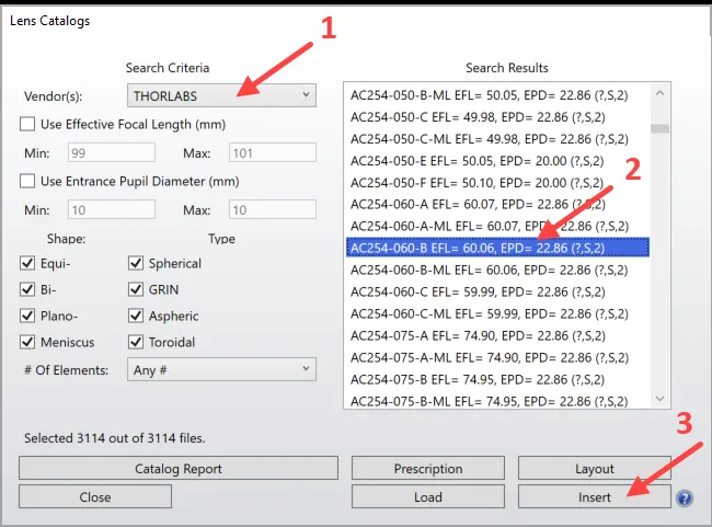 OpticStudio提供了包含大量商用镜头的镜头库,可以通过镜头库(Lens Catalog)找到所需镜头并将其插入镜头文件: