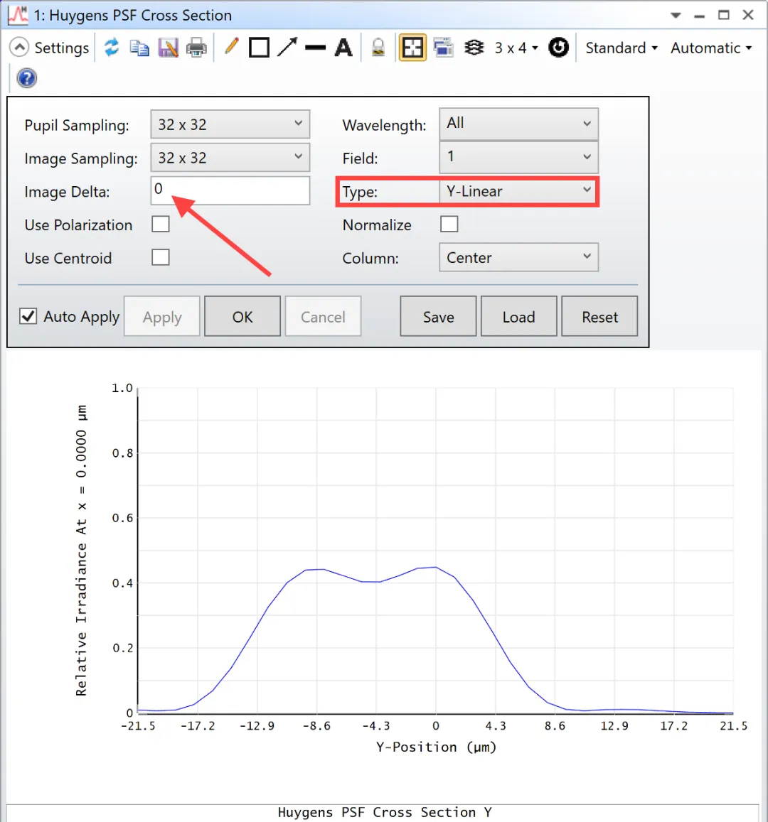 然后我们点击Analyze…Huygens PSF Cross Section。正如我们在显示的图中看到的,两个波长的点扩散函数(PSF)彼此相近,但它们仍可分别识别为0 μm和约-9 μm的两个峰: