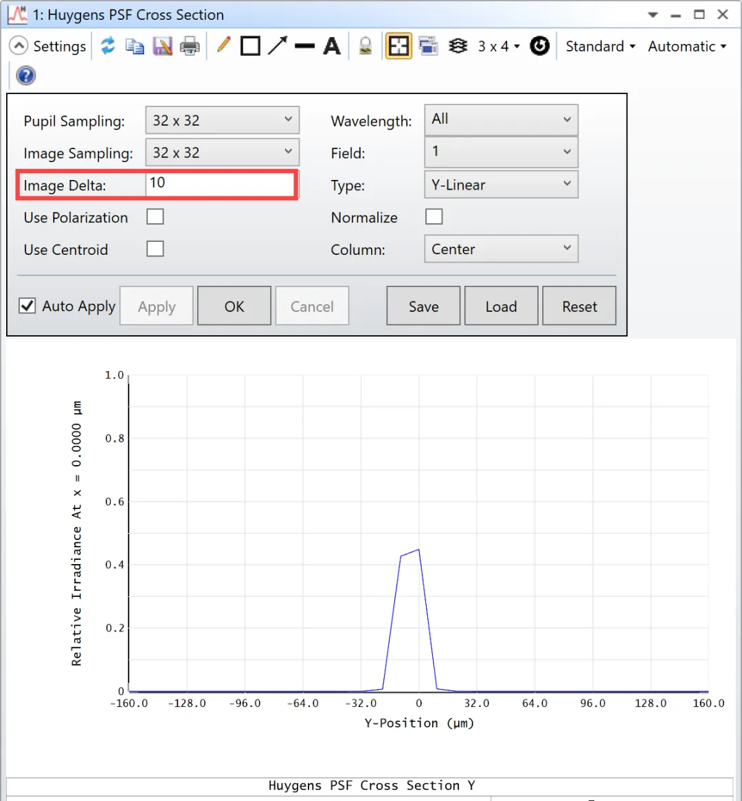 限制光谱仪分辨率的另一个因素是使用线相机采样频谱时的像素宽度。OpticStudio提供了一种非常方便的方法来检查惠更斯PSF横截面图中的此行为:将图像Delta设置为10将平均信号宽度超过10μm,即相机像素的宽度。正如你所看到的,两个峰值不再可区分: