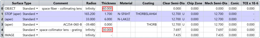 由于镜头的焦距是60mm,因此我们将表面0的厚度设置为60mm,以满足从光纤到准直透镜的距离。此外,还增加了准直透镜和衍射光栅之间的空间距离,由于光束是准直的,则此空间距离值为30mm并不重要。将表面1设为光阑: