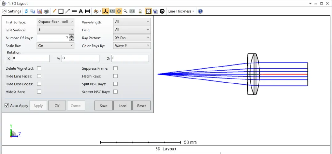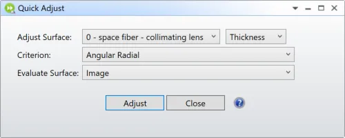 现在打开以上设置得到的三维布局图,你会注意到光线在镜头后没有准直。其原因是透镜还未处于相对于光纤的准确位置。OpticStudio的快速调整 ( Quick Adjust ) 功能 (通过点击:优化 ( Optimize ) > 快速调整 ( Quick Adjust ) 打开)是执行简单优化任务的非常方便的工具。选择如下参数,并调整两次:
