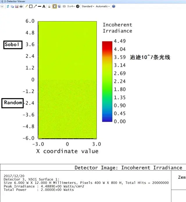 如果我们对每个光源都追迹10^4条光线,Detector Viewer结果图如图2所示,图中很难看出两者的差距。