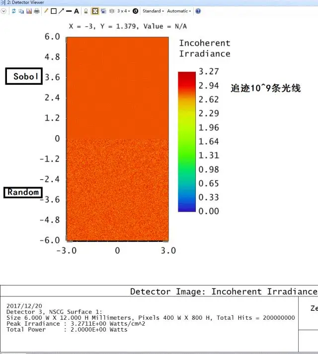 本文以一个简单的光学系统为例,系统中两个矩形光源照亮探测器,此光源会产生均匀的矩形光线分布。下图为光线追迹的结果,图中上方为随机取样下方为Sobol 取样。