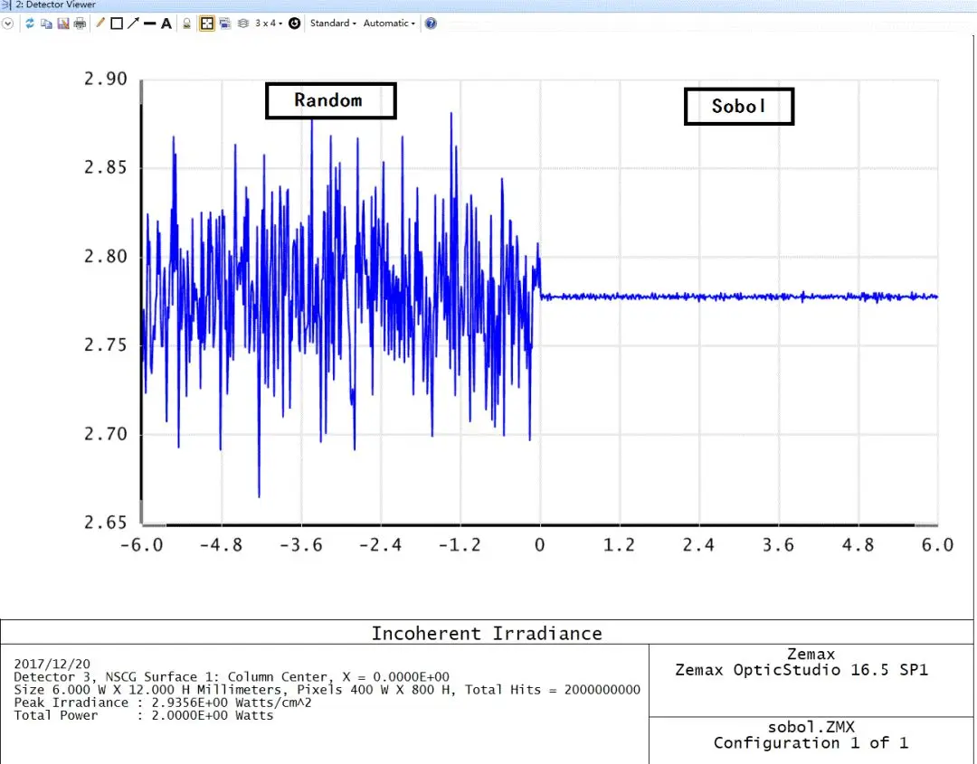 当然,所有基于电脑的随机数生成算法都是伪随机的(quasi-random)。它们受限于一个周期,当超过周期后就会重复出现,而不再是相互无关的随机数。这个周期的最终限定是由电脑的位数来决定的,因此,没有一个内建的随机数是“真正”随机的。(但是本文我们认为OpticStudio中的长周期随机数产生器是“真正”的随机,这样就可以用来和Sobol取样模式对比。)