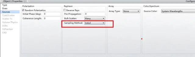 Sobol 取样并不是万能的,在本文范例中我们已经知道了光源应该是均匀分布的,因此可以确定Sobol 取样优于随机取样。但是请注意在所有的Monte Carlo分析过程中没有一种方法比随机取样更准确。因此,OpticStudio允许使用着自己决定是使用Sobol 取样还是使用OpticStudio内置的长周期随机数产生器。使用者可以在对象属性编辑窗中的Source栏下选择。