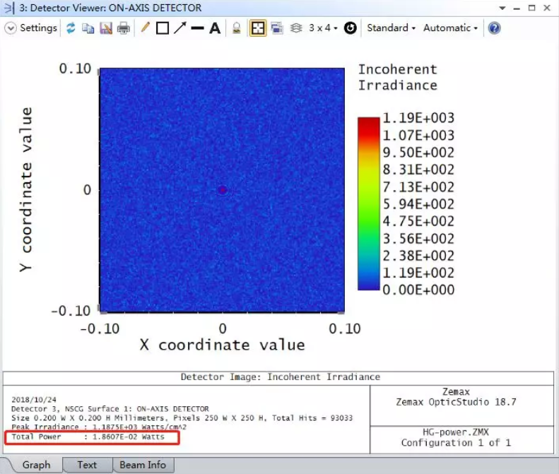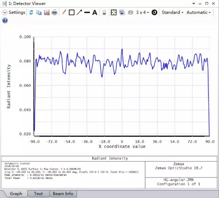 在系统中,散射体之后4mm的位置为一个巨大的探测器来测量光线经过散射体后的辐射强度 (Watts/steradian)分布。对于g=0.001,分布为均匀分布: